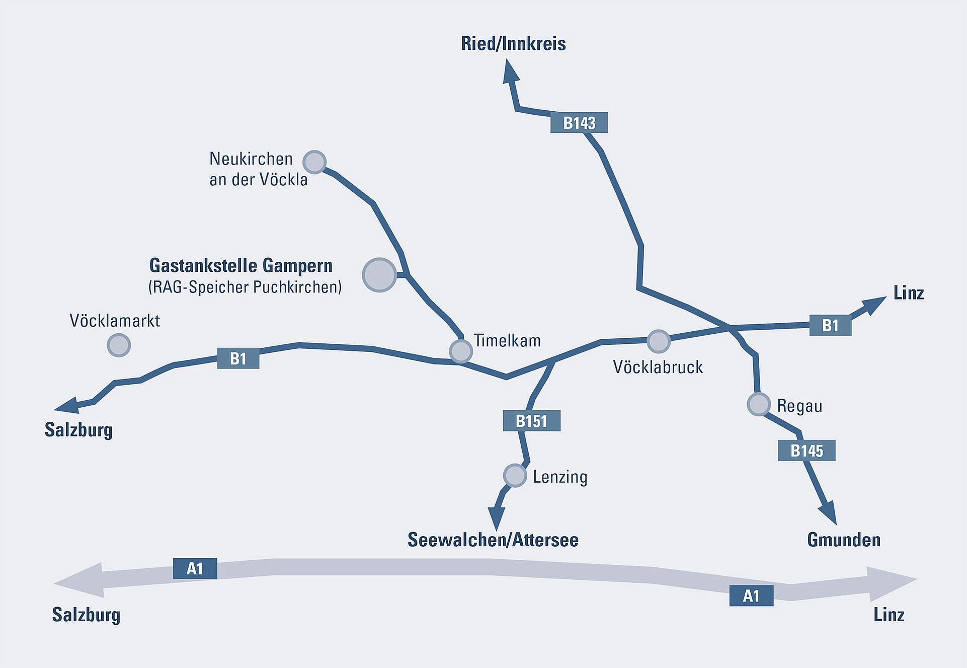 Seit 2014 ist die erste öffentliche Erdgastankstelle der RAG in Gampern in OÖ (Nähe Vöcklabruck) in Betrieb.
